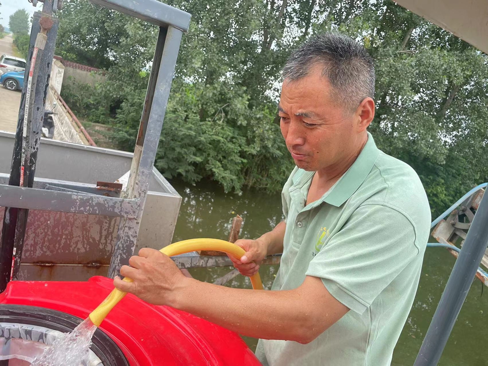 8月2日上午,潘村湖农场公司职工黄立勇顶着炎炎烈日给植保机加水,为即将进行的大豆施药作业做好准备。(蒋俊 摄)