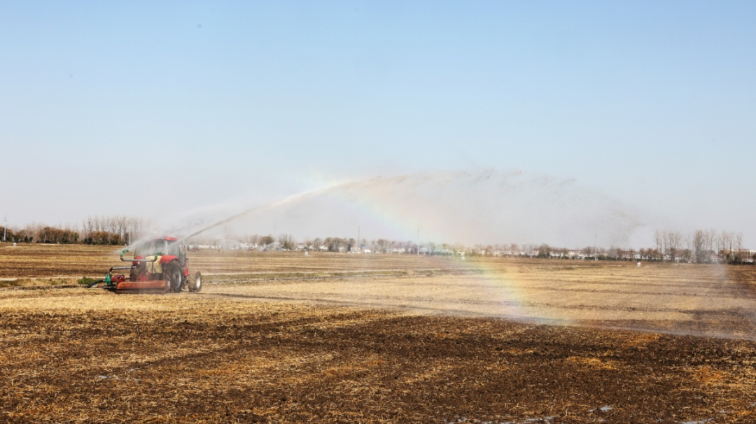 华阳河农场针对部分晚稻茬小麦土壤墒情不足的情况,迅速组织喷灌抗旱,实施精准补水,确保稻茬麦齐苗越冬。(李龙)