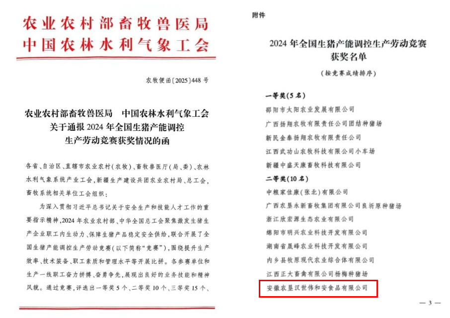 2025年5月27日,农业农村部与中华全国总工会联合发布2024年全国生猪产能调控生产劳动竞赛评选结果,安徽农垦汉世伟和安公司荣膺竞赛二等奖。此前,该公司在2024年初举办的安徽省生猪产能调控基地生产劳动竞赛中已荣获一等奖,并因此获得代表安徽省角逐全国奖项的资格。(俞皖黔)